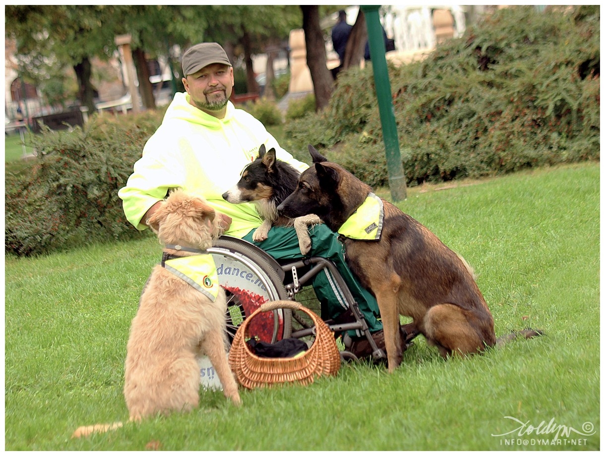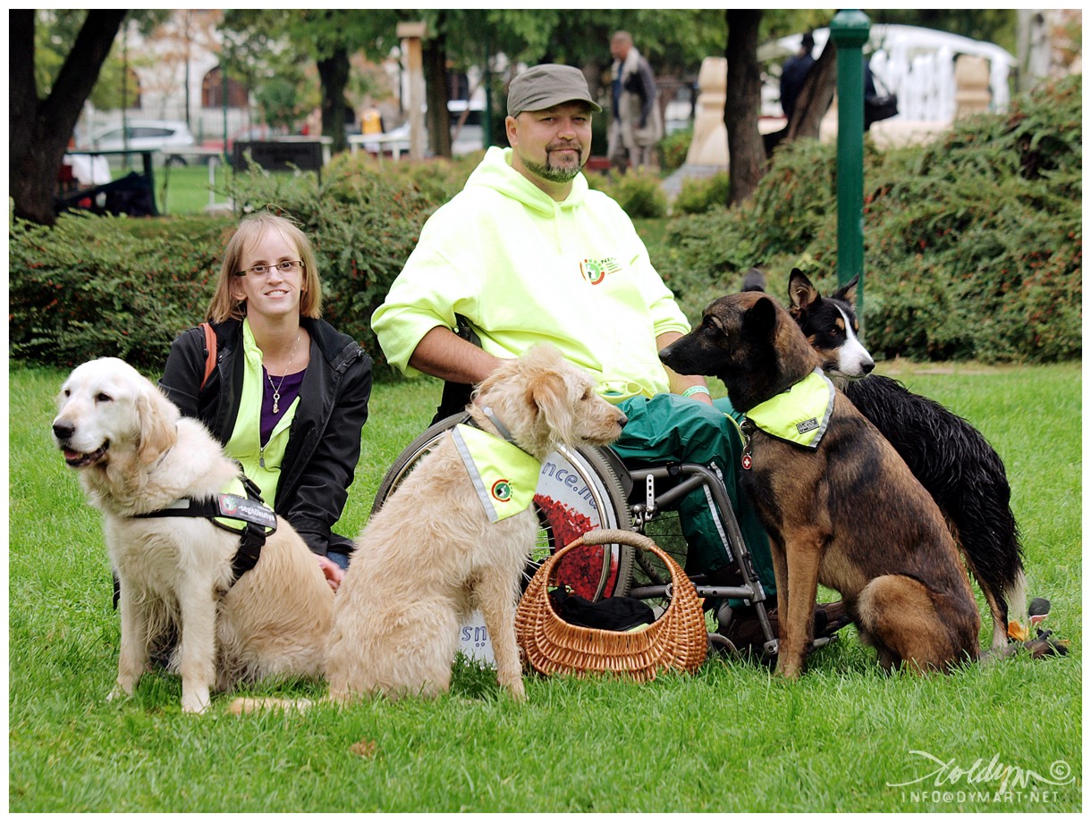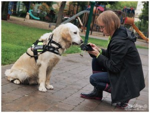 A hangjelző kutya bemutatón a táskámat Ricsi elé tettem le. Amikor Era rám csörgött, Kuku óvatosan, nagy ívben megkerülte Ricsit, és szinte lábujjhegyen ment oda a retikülömhöz, megmutatni, honnan szól a telefonom. Csak el ne kövessen hibát! A bemutató után odajött hozzánk egy fotós. Szeretett volna úgy is fényképet készíteni, hogy Ricsi körül vannak a kutyák. Kukut odavittem hozzá, és lefektettem. Kuku először csak döbbenten nézett rám, majd szép lassan elkezdett kúszni felém. Ezt párszor elismételtük, de hamar rájöttük, hogy Kuku Ricsi közvetlen közelében nélkülem nem fogja kivitelezni a szabályos helyben maradást. Ezért én is odamentem és leguggoltam a kutyák közé, a fotó kedvéért. Kuku így már ott maradt, de azért a biztonság kedvéért hátat fordított Ricsinek. Ez még kellett az érzékeny lelkének. 🙂