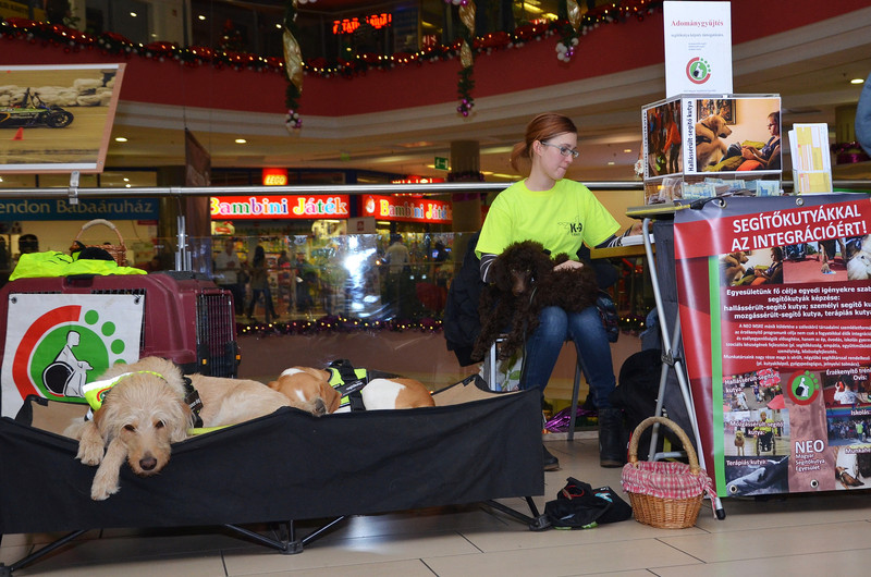 Múlt szombaton Kecskemétre utazott a csapatunk: Archievel, Joyával, Nyafival, T-vel, Cooperral és Kukuval adományt gyűjtöttünk az Egyesületnek. A kecskeméti Malom Központ megjelenési lehetőséggel támogatta a NEO-t. Mikor megérkeztünk, elfoglaltuk a számunkra kijelölt asztalt, és megkezdődött az intenzív munka! Nem is volt olyan egyszerű, mint amilyennek látszott! Tömeg, szórólap-osztogatás, kérdésekre válaszolás, rögtönzött segítőkutya-bemutatók, játékok… Izgalmas, de kimerítő nap volt. Néhány óra múlva a kutyák egy része az ágyon, a másik része pedig a boxban szundikált. Elfáradtak, ahogy én is! Csak egyvalaki dolgozott ugyanolyan rendíthetetlenül: Kuku. Neki az ismerkedésből sose elég! Számára ez olyan „munka”, ami egyben a hobbija is. Miközben pihentünk egy kicsit, néztük Kukut, és szinte fogadásokat kötöttünk, hogy mikor fog elfáradni. A délután folyamán Kuku egyszercsak lefeküdt, és abbahagyta a farokcsóválást. Ekkor összesúgtunk: na, most már Kuku is elfáradt! Amint befejeztük a mondatot, jött egy újabb érdeklődő, és Kuku felpattant. Neki elég volt ennyi szünet, csak ki ne maradjon valami jóból! Ment tovább lengetni a farkát, simogattatni magát és barátkozni. Azt hiszem, aznap Kuku a „fáradhatatlan kutya” oldalát mutatta. Két vonatozás, egésznapos munka után se tűnt olyan megviseltnek. Gyöngyi hazafelé, a vonaton kérdezte, hogy mit gondolok, egy ilyen nehéz nap után is jelzi-e nekem a zajokat. Kíváncsivá tett, és így otthon kipróbáltuk a telefoncsörgést és a névszólítást. Büszkén mondom: jelezte. Megnyugtatok mindenkit, azért Kuku se egy gép! Ezután elaludt, és másnap reggelig meg se mozdult. Estére Kuku is lemerült, mint egy akku.