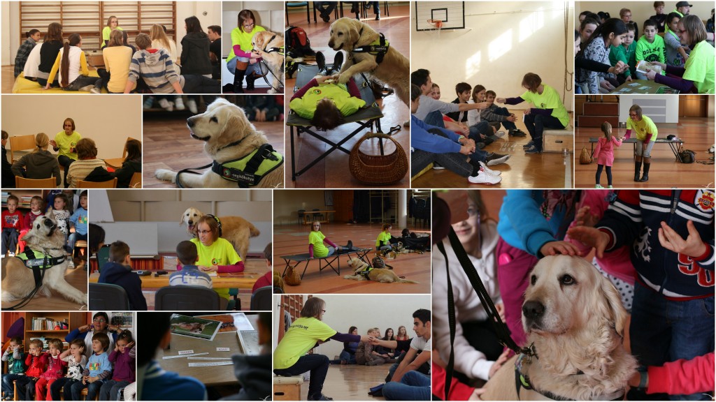 A Norvég Civil Támogatási Alap támogatásának köszönhetően az elmúlt hónapokban több óvodában, iskolában és munkahelyen tarthattunk érzékenyítő tréninget, Kukuval a „hallássérült szekciót” szoktuk képviselni. Gyógypedagógia, esélyegyenlőség, szociológia és kutyázás együtt, ez igazán nekem szól! Akármilyen fárasztóak ezek a programok, ugyanolyan élvezettel csinálom, mint az elején. Számomra hihetetlen, hogy Kuku hogy tudja oldani bennem és az emberekben is azt az esetleges feszültséget, ami a kommunikációs problémáinkból ered. Kuku szerepe a találkozás első perceiben hatalmas. És ő mintha pontosan tudná, mi a dolga: „Váratlanul ért a Gazdi furcsa kiejtése? Nem értette meg, amit kérdeztél tőle? Semmi gond, nyugi! Simogass csak meg engem, és ha sikerült összeszednetek a gondolataitokat, próbáljátok meg újra!” „Nézzétek, hogy jelzem a Gazdámnak a zajokat?! Látjátok, milyen ügyes kutya vagyok?! Nem kell őt sajnálni ám, legfeljebb irigyelni! Na, ugye, milyen klassz neki, hogy ilyen segítő társa lehet, mint én!?”