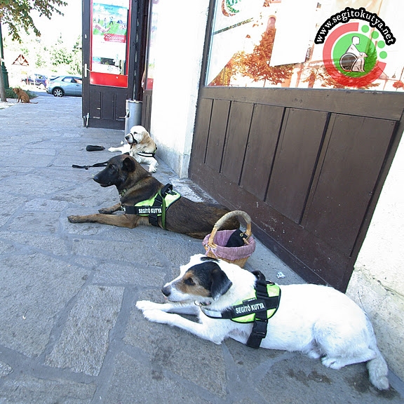 2. Ebédidőben vettük a boltban valami rágcsálnivalót, Kukut Oszi és Cooper társaságában hagytam az üzlet előtt. Végig nyugodtan fekve maradt. Pedig nem csak a két segítőkutya-társában rejlett számára játéklehetőség, hanem a fotón látható, háttérben lévő vizslában is.