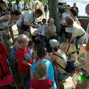 3. A bemutató végén egyszerűnek tűnő, de számunkra nehéz feladatot kaptunk: a közönség tagjai között kellett a szórólapunkat szétosztogatni. Kuku úgy csinált, mintha nem érdekelné, hogy a segítőkutyákat körülrajongó emberek kellős közepén van. De lehet, hogy már halálosan unta az egészet és legszívesebben hazament volna pihenni.
